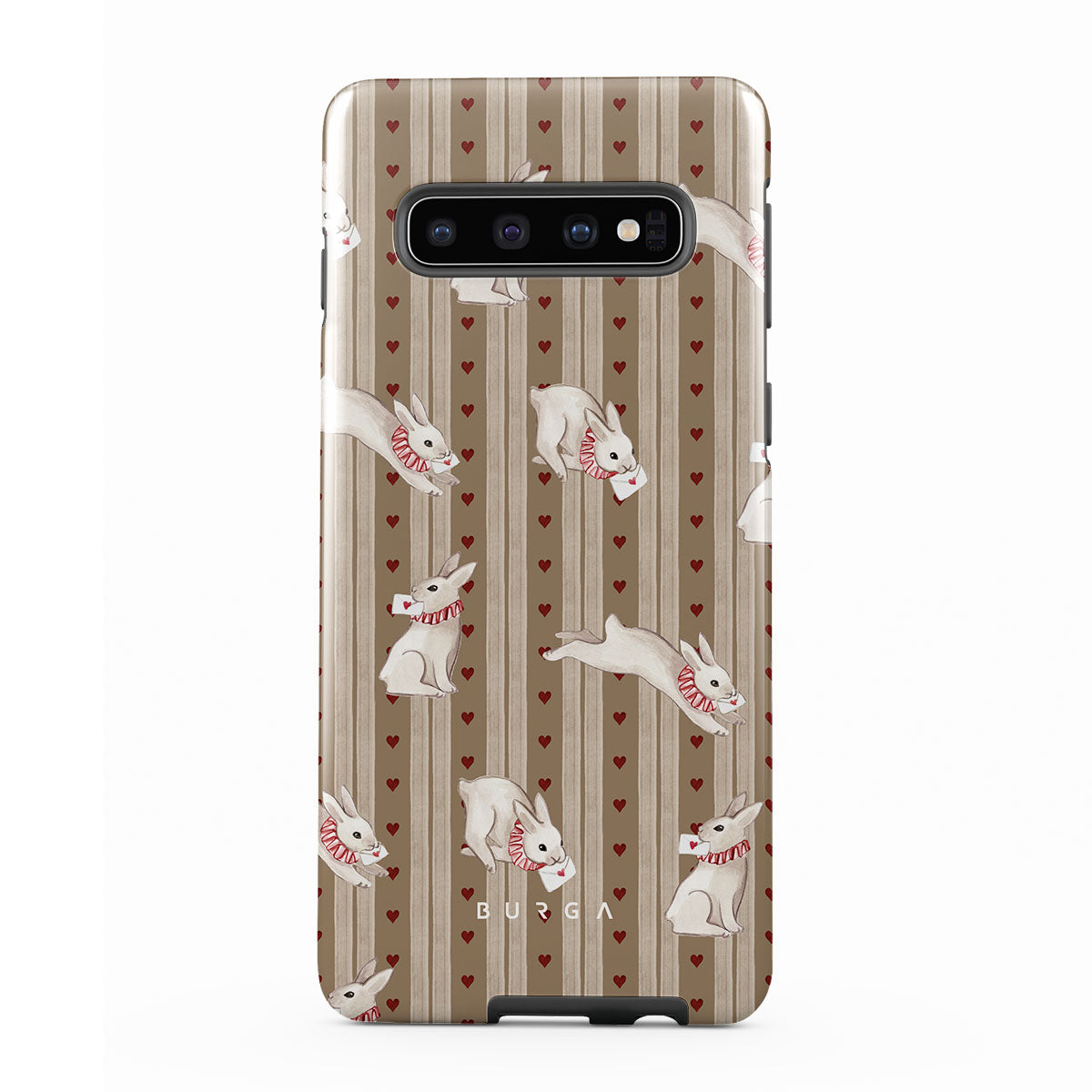 The Late Again Samsung Galaxy S10 4G phone case design is a love letter lost in time—scattered hearts, hurried notes, and white rabbits racing against a clock that refuses to be tamed. Sent, but never received. Read, but never answered. Always running, always chasing, always just a moment too late.