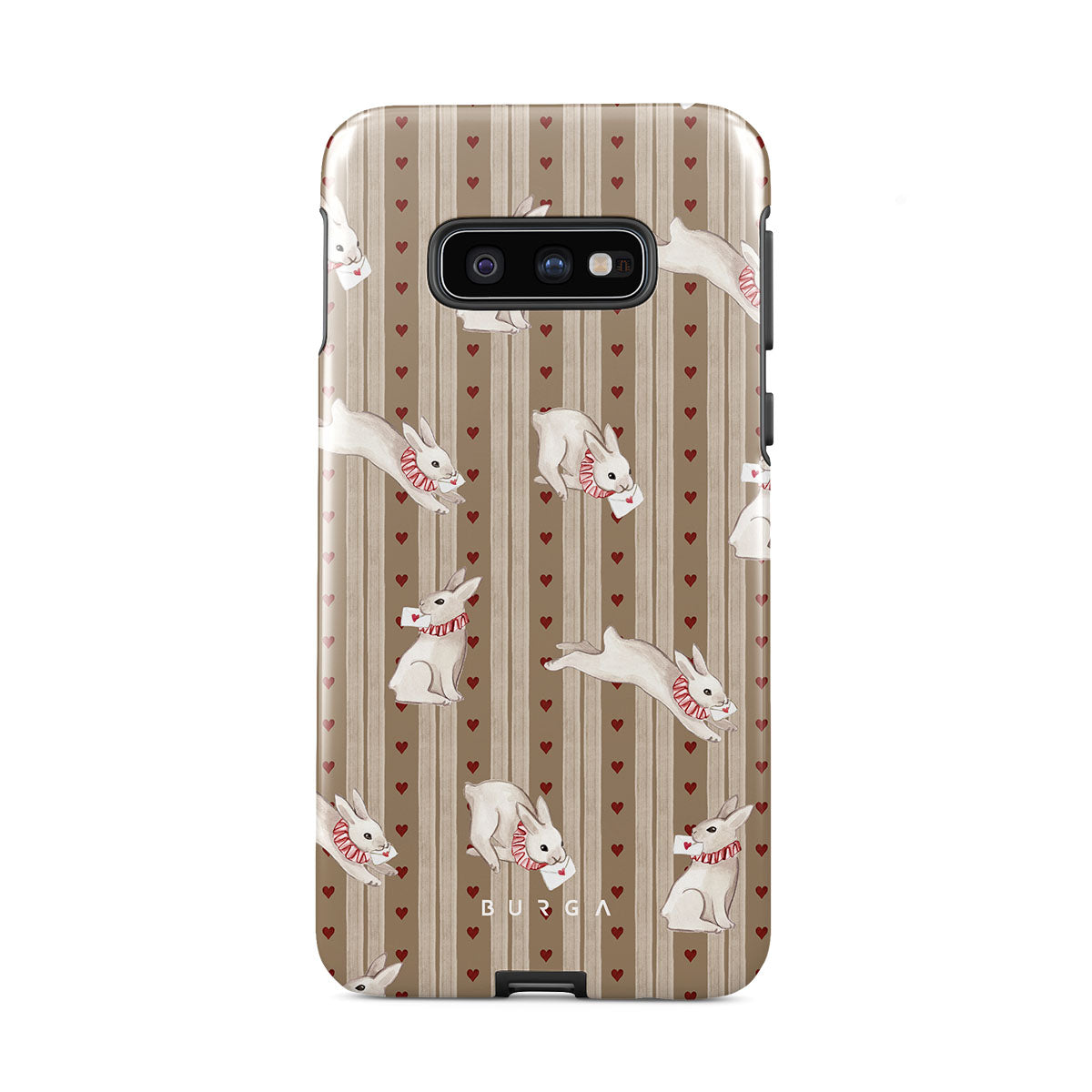 The Late Again Samsung Galaxy S10E phone case design is a love letter lost in time—scattered hearts, hurried notes, and white rabbits racing against a clock that refuses to be tamed. Sent, but never received. Read, but never answered. Always running, always chasing, always just a moment too late.