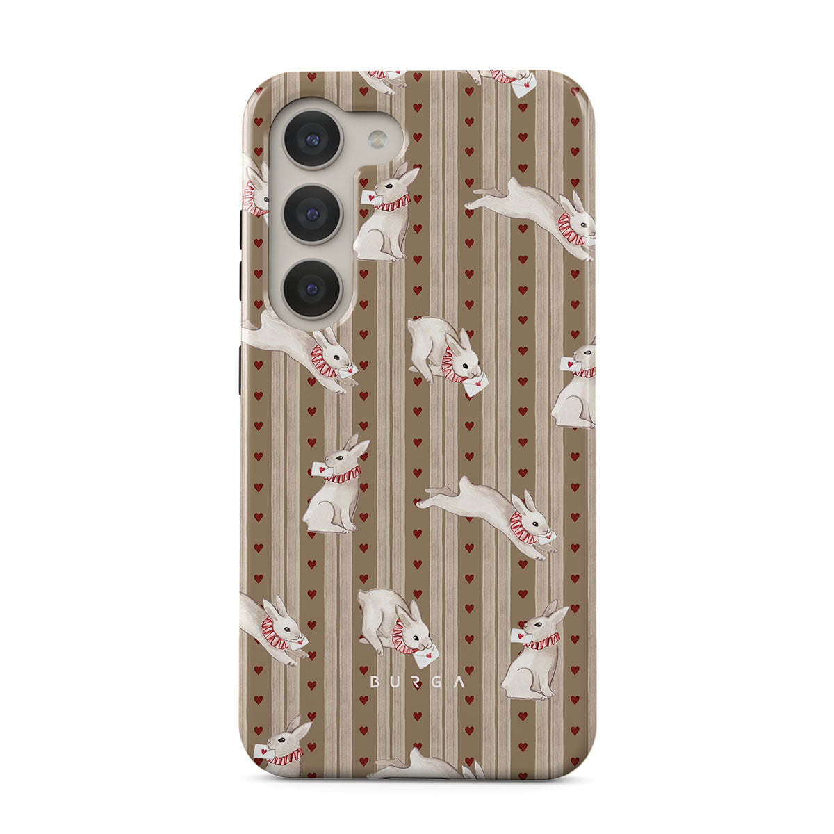 The Late Again Samsung Galaxy S23 phone case design is a love letter lost in time—scattered hearts, hurried notes, and white rabbits racing against a clock that refuses to be tamed. Sent, but never received. Read, but never answered. Always running, always chasing, always just a moment too late.