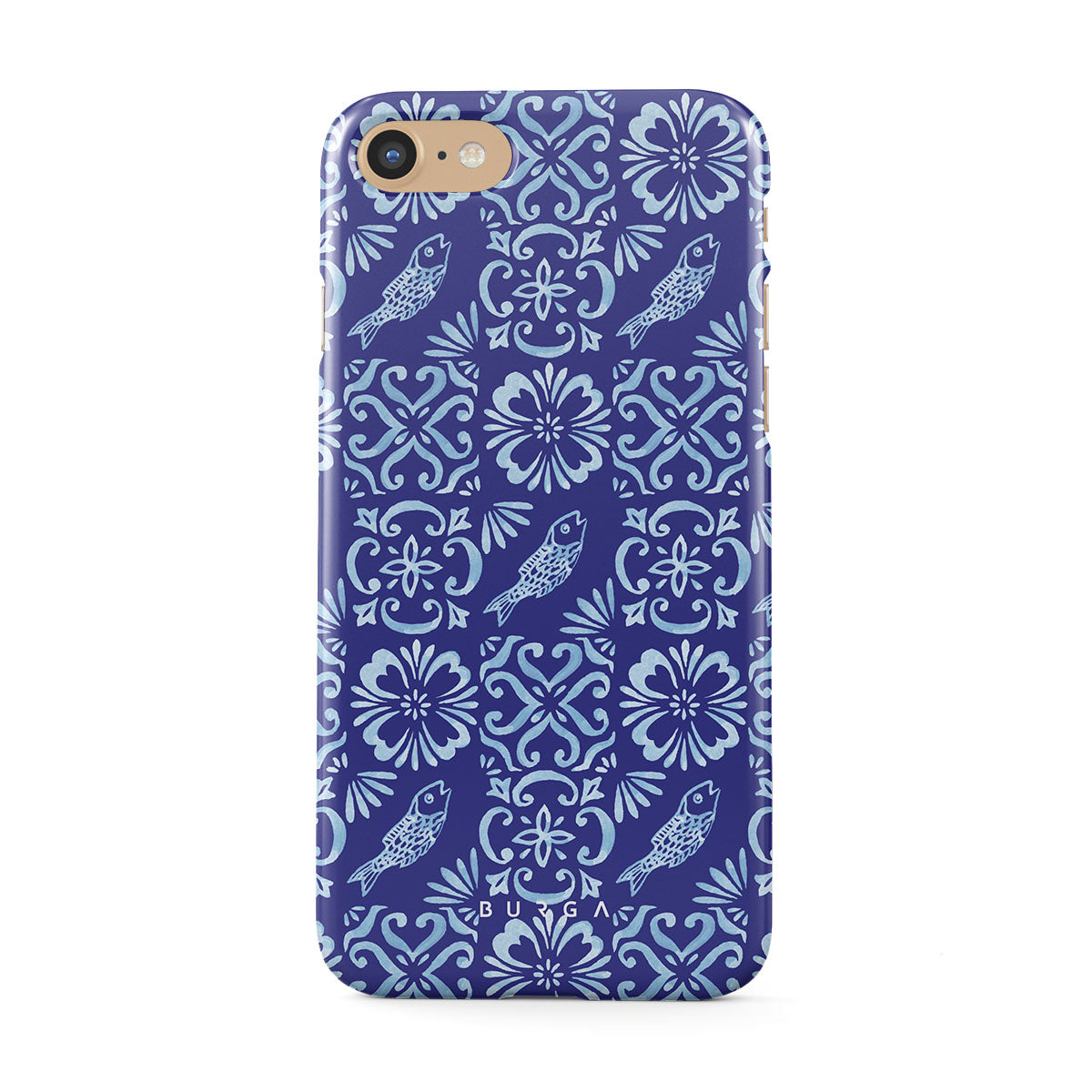 This design features: Portuguese tile patterns, deep blues, floral patterns, flowers, fish