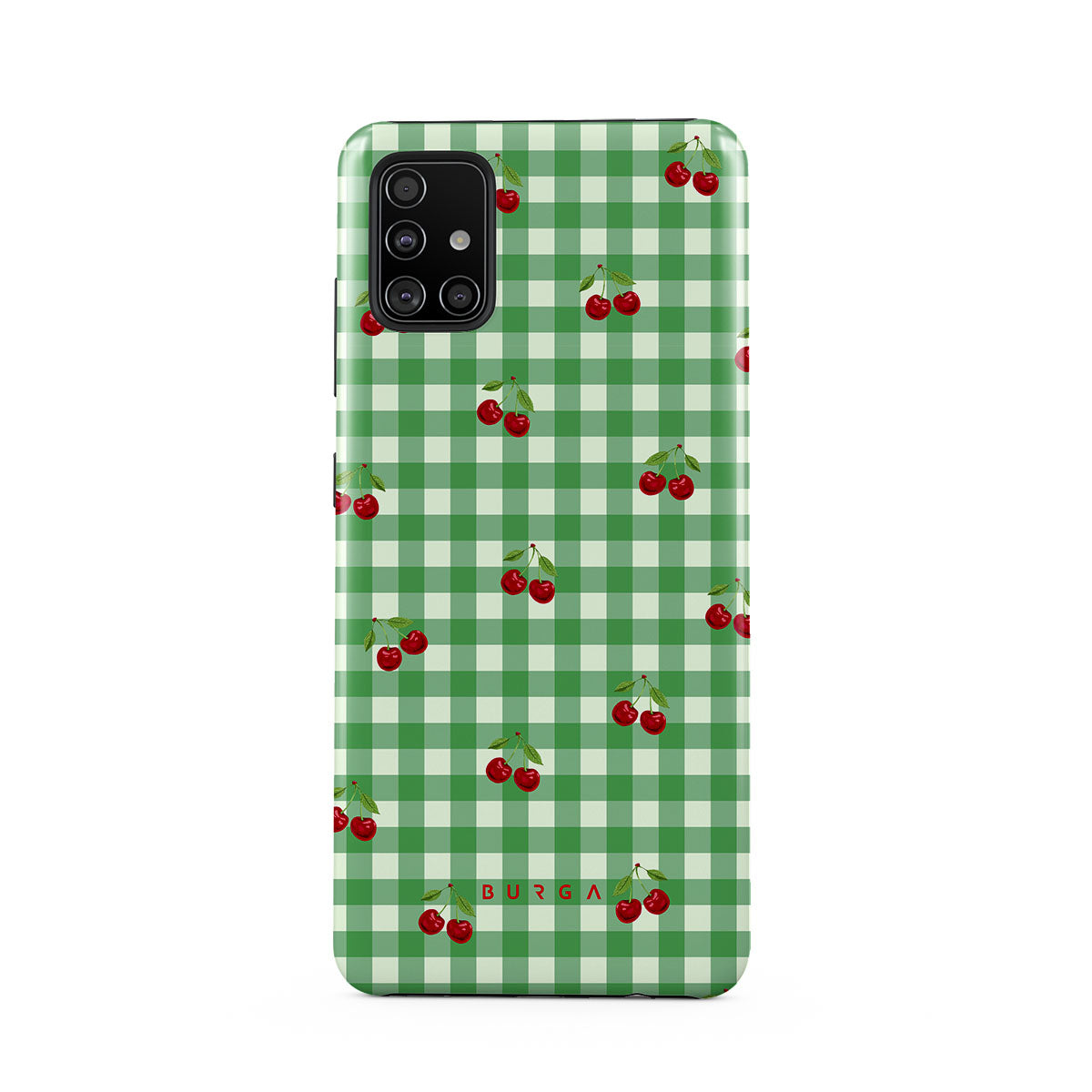 The Little Life Samsung Galaxy A51 4G phone case design: green checks, simple and true, like a patch of grass under a tree, where you can sit and watch the small world go by, every leaf a chapter in nature’s story.