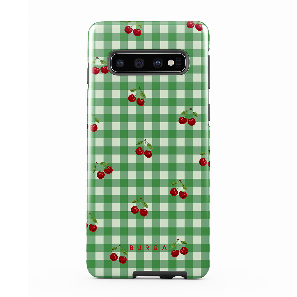 The Little Life Samsung Galaxy S10 4G phone case design: green checks, simple and true, like a patch of grass under a tree, where you can sit and watch the small world go by, every leaf a chapter in nature’s story.