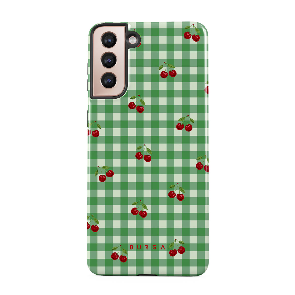 The Little Life Samsung Galaxy S21 Plus phone case design: green checks, simple and true, like a patch of grass under a tree, where you can sit and watch the small world go by, every leaf a chapter in nature’s story.