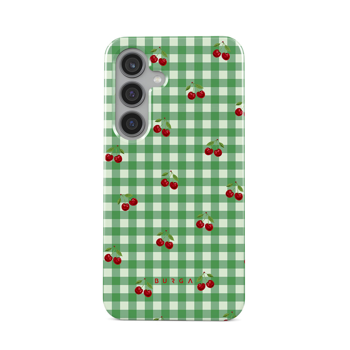 The Little Life Samsung Galaxy S24 Plus phone case design: green checks, simple and true, like a patch of grass under a tree, where you can sit and watch the small world go by, every leaf a chapter in nature’s story.