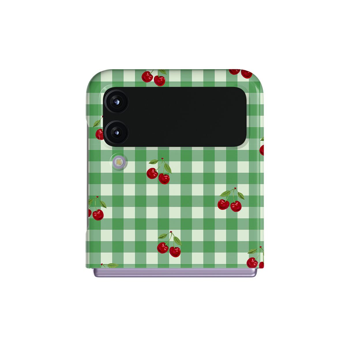 The Little Life Samsung Galaxy Z Flip 4 phone case design: green checks, simple and true, like a patch of grass under a tree, where you can sit and watch the small world go by, every leaf a chapter in nature’s story.