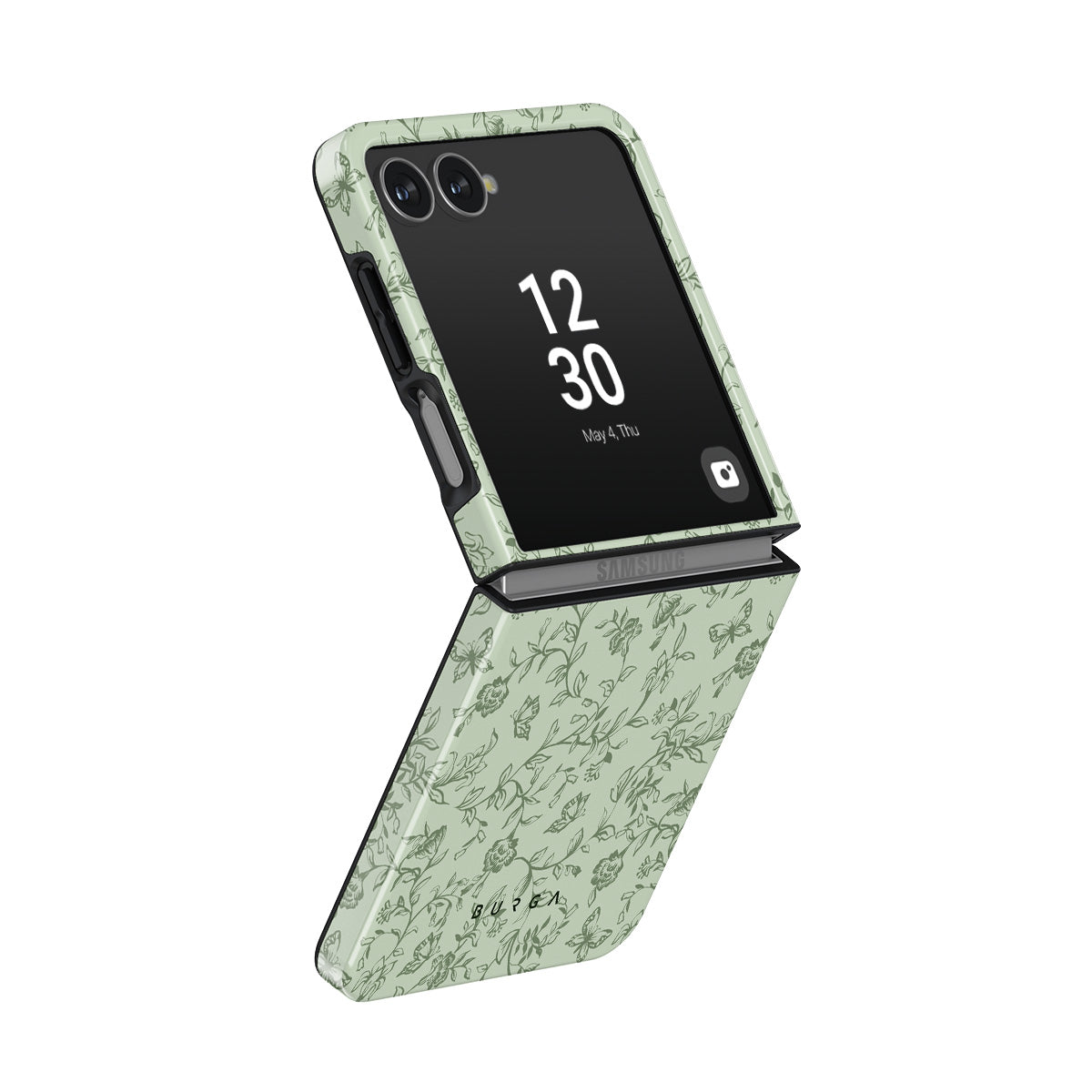 Soft green butterflies, delicate flowers, the kind of dream you wake up from but can’t quite shake. The Lost in Thought Samsung Galaxy Z Flip 7 phone case design lingers like a half-remembered story, floating just out of reach. Was it real? Or just another trick of Wonderland?