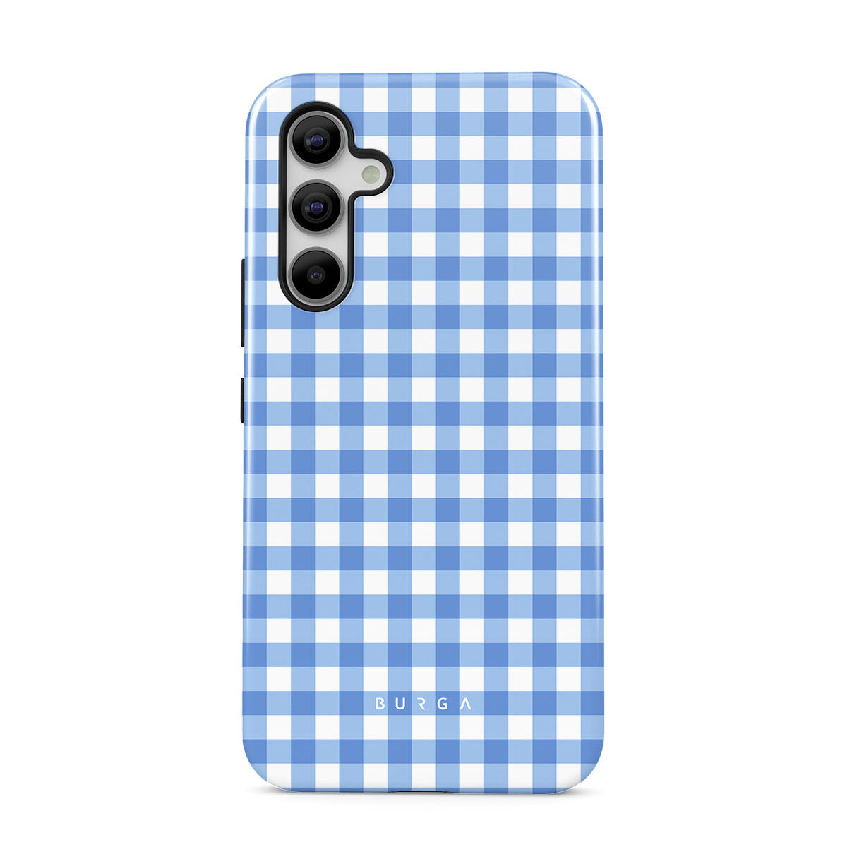 Crisp blue checks are your invitation to lay on the grass, look up at the sky, and find shapes in the clouds—simple joys that make any day lovely. That’s our Lovely Day Samsung Galaxy A54 phone case design.