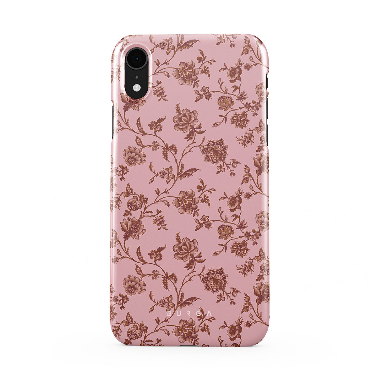 The Lover iPhone XR phone case design: because you're a Lover, not a fighter. Delicate floral motifs across a soft pink background capture the essence of timeless beauty and rustic elegance. Perfect for modern-day cowgirls with a vintage heart.