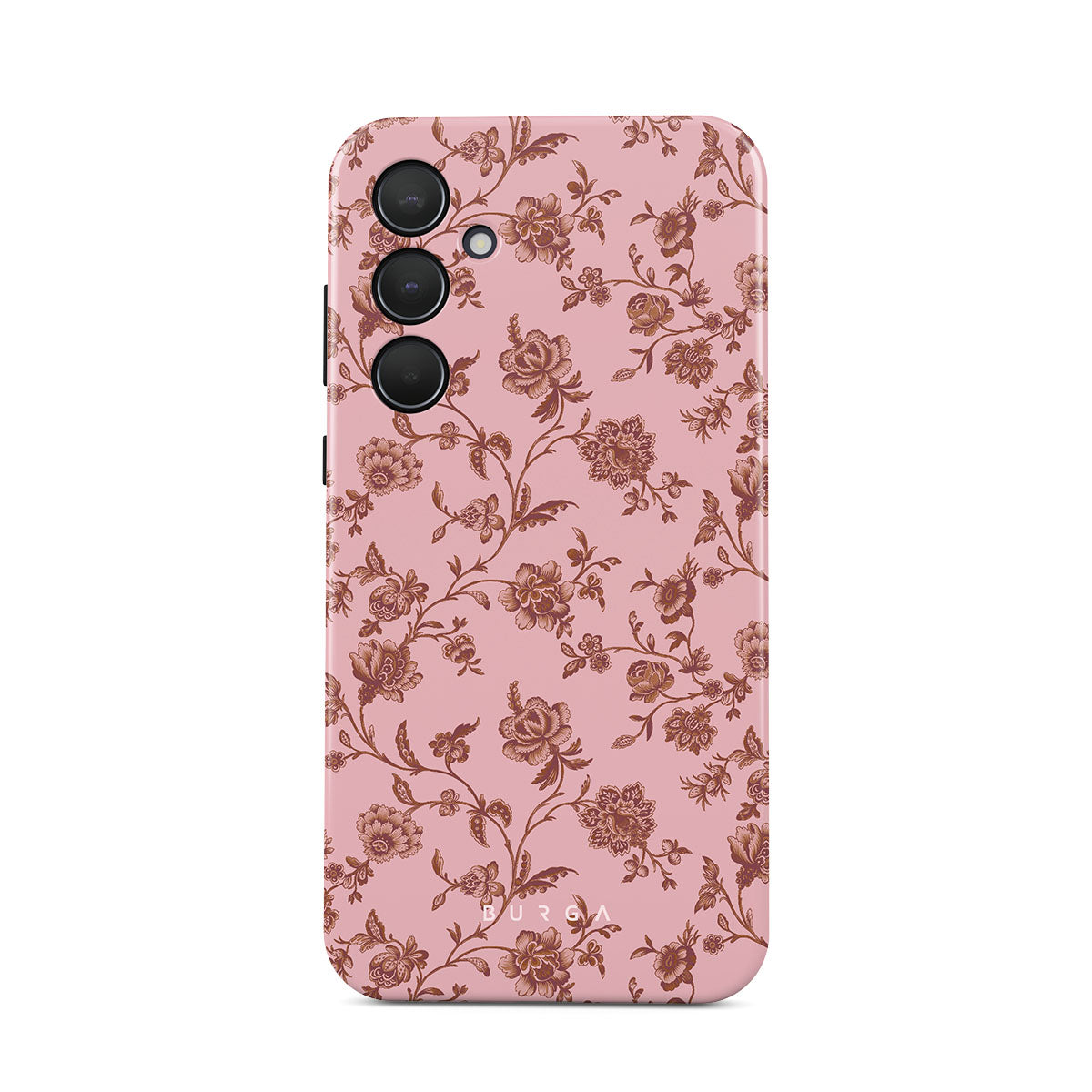 The Lover Samsung Galaxy A35 phone case design: because you're a Lover, not a fighter. Delicate floral motifs across a soft pink background capture the essence of timeless beauty and rustic elegance. Perfect for modern-day cowgirls with a vintage heart.