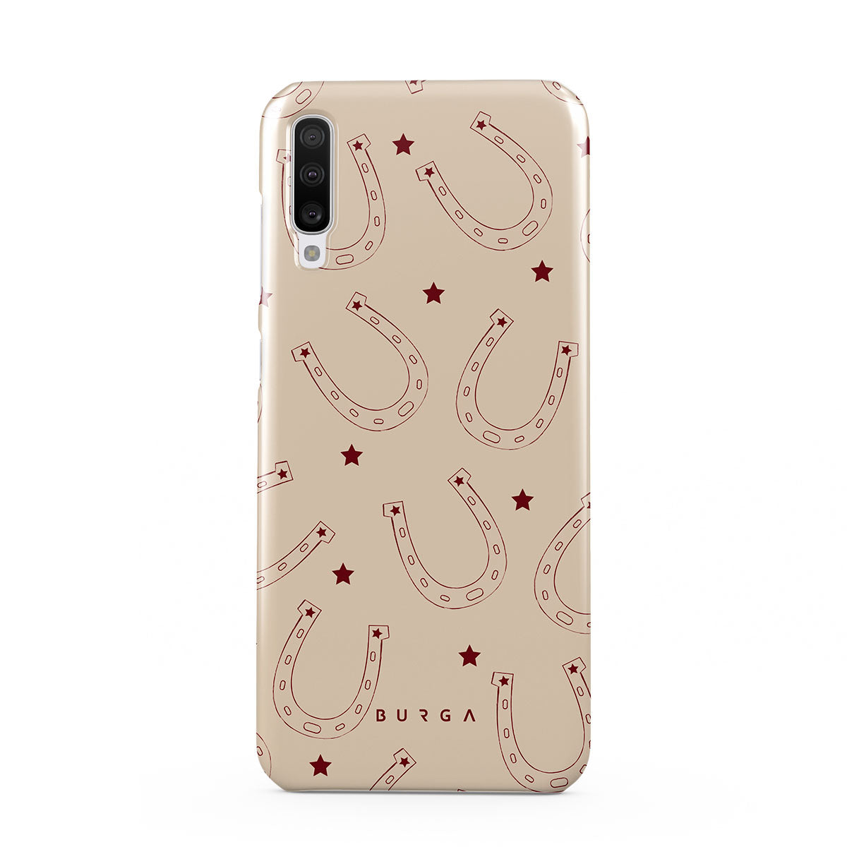 Horseshoes for luck, stars for style. Keep fortune on your side with our Lucky Charm Samsung Galaxy A70 phone case. This design is a playful take on traditional symbols of luck. The earthy tones make it a versatile accessory for any western-inspired outfit—and not only.