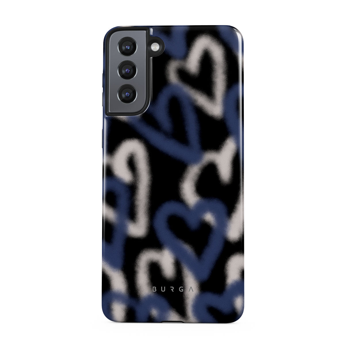 The Lucky You Samsung Galaxy S21 phone case captures the raw, unfiltered pulse of street art. Graffiti hearts in striking blue and white stand out against a black background, their edges softly faded. It’s a design that speaks to the restless who find beauty in chaos and dare to be different.