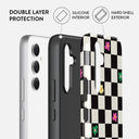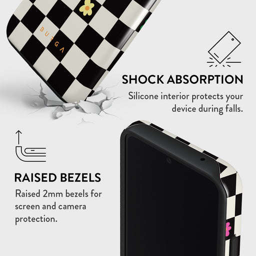 Take time to relax with our Lunch Break - Samsung Galaxy A55 phone case. The playful addition of colorful retro flowers to the classical black and white checkered pattern will add that extra pop of color. It will bring that much-needed *oomph* to your phone. With this playful design, you can keep your phone cute and protected!