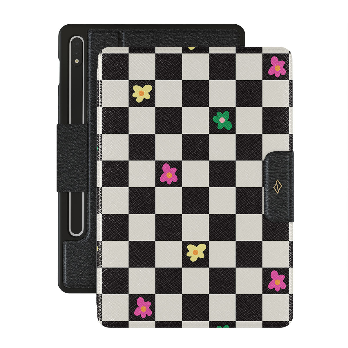 Take time to relax with our Lunch Break - Samsung Galaxy Tab S8+/S7+/S7 FE folio case. The playful addition of colorful retro flowers to the classical black and white checkered pattern will add that extra pop of color. It will bring that much-needed *oomph* to your Galaxy Tab. With this playful design, you can keep your Galaxy Tab cute and protected!