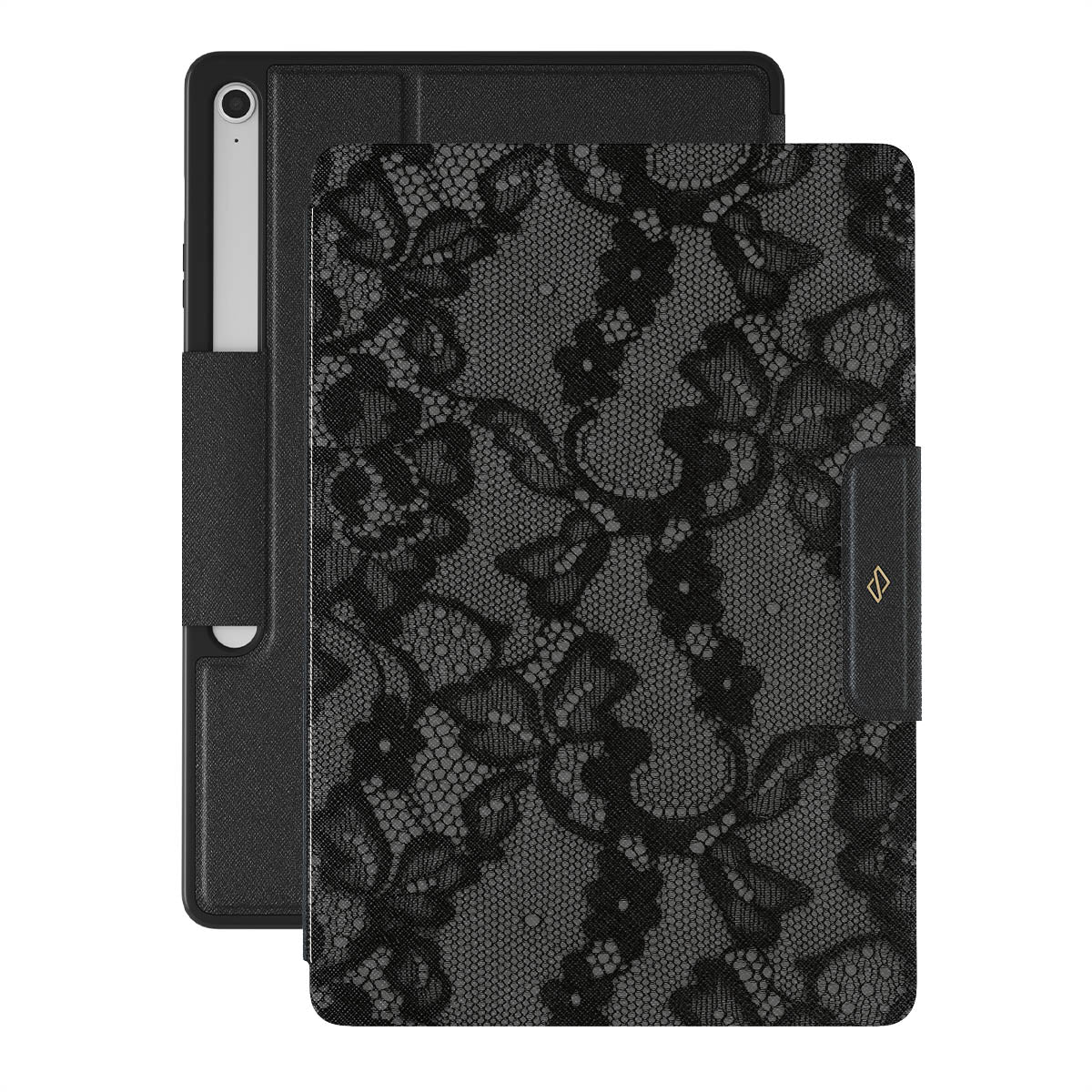 Inspired by the intricate patterns of lace gowns, our Magnetic design is perfect for those with a love for the drama and romance of old Hollywood. This Samsung Galaxy Tab S10+ FE folio caseis a statement of effortless, mysterious femininity, turning you into the main character where you go.