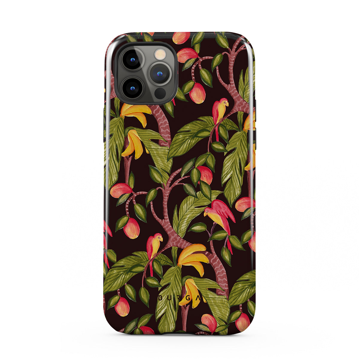 A lush botanical fantasy where ripe mangoes hang like forbidden fruit. Deep greens and juicy oranges pull you into a tropical escape. If this iPhone 12 Pro phone case design had a voice, it would purr.
