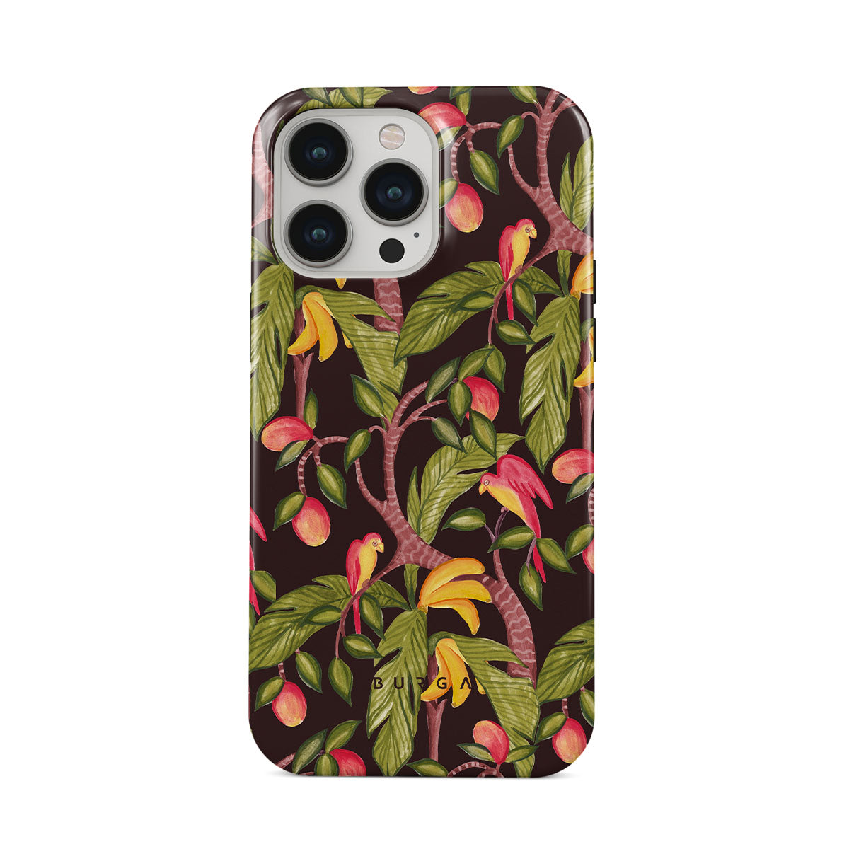 A lush botanical fantasy where ripe mangoes hang like forbidden fruit. Deep greens and juicy oranges pull you into a tropical escape. If this iPhone 14 Pro phone case design had a voice, it would purr.