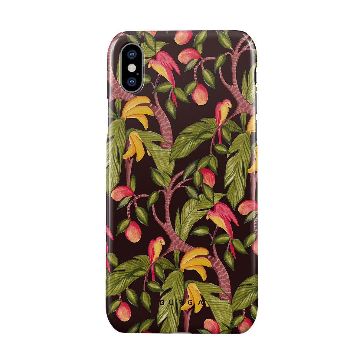 A lush botanical fantasy where ripe mangoes hang like forbidden fruit. Deep greens and juicy oranges pull you into a tropical escape. If this iPhone X / XS phone case design had a voice, it would purr.