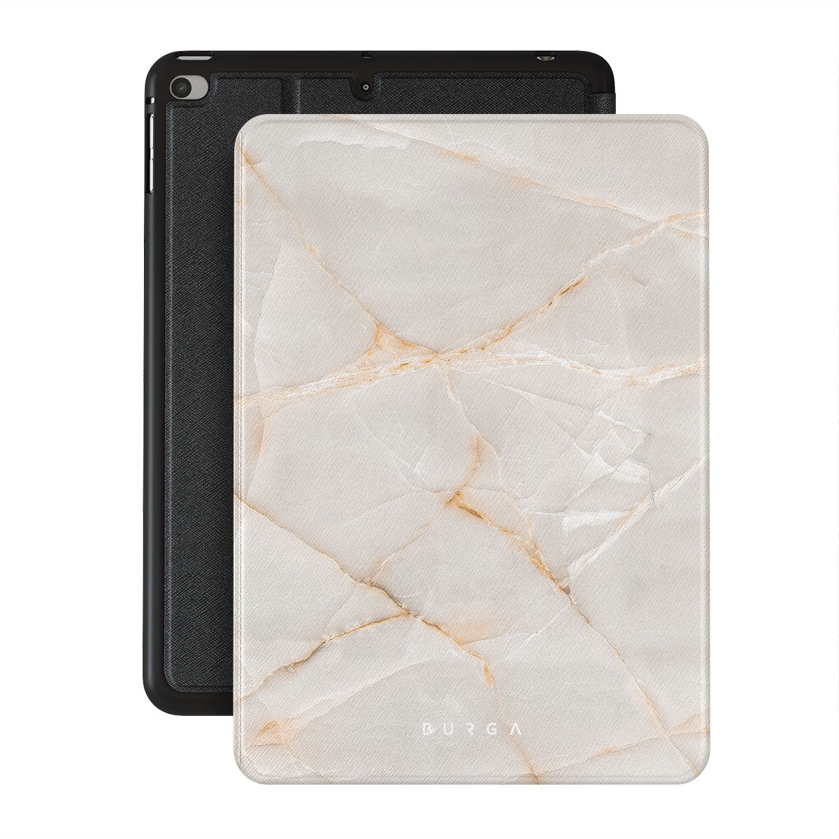 The Vanilla Sand Marble iPad Mini 7.9 (5th Gen) folio case cover features a marble design with creamy canvas showcasing beautiful golden hues. The soft-toned case will add a touch of luxury to the device while protecting it from dangerous falls.