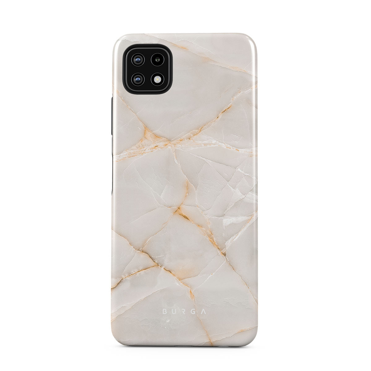 The Vanilla Sand Marble Samsung Galaxy A22 5G phone case cover features a marble design with creamy canvas showcasing beautiful golden hues. The soft-toned case will add a touch of luxury to the device while protecting it from dangerous falls.