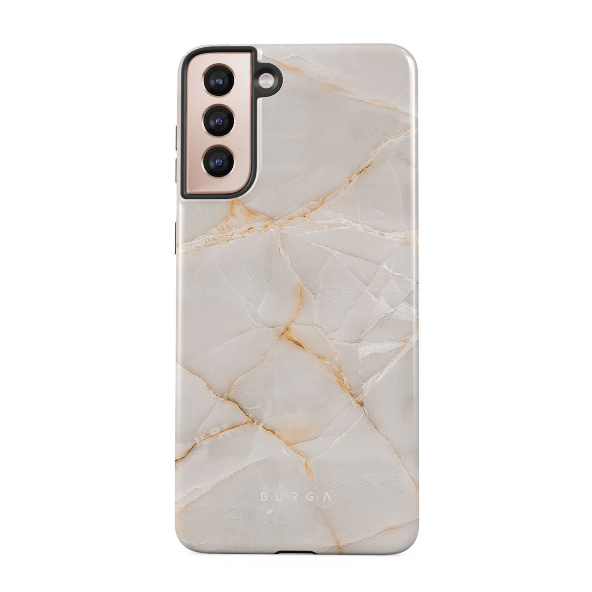 The Vanilla Sand Marble Samsung Galaxy S21 Plus phone case cover features a marble design with creamy canvas showcasing beautiful golden hues. The soft-toned case will add a touch of luxury to the device while protecting it from dangerous falls.