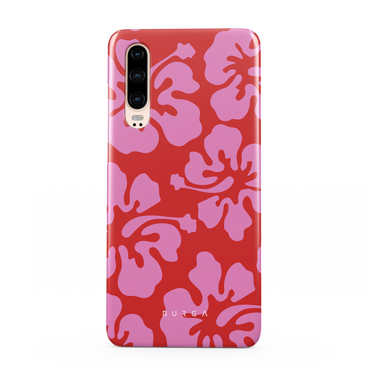 Dive into a sea of floral fantasy with Me Gustas Tu. Featuring oversized coral-toned blooms against a fiery backdrop, this Huawei P30 phone case design captures the wild heart of tropical flowers—perfect for those who want to carry a touch of exotic flair.