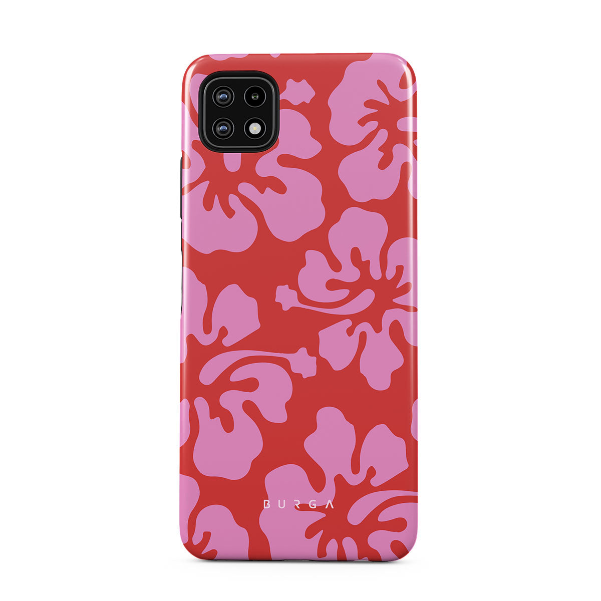 Dive into a sea of floral fantasy with Me Gustas Tu. Featuring oversized coral-toned blooms against a fiery backdrop, this Samsung Galaxy A22 5G phone case design captures the wild heart of tropical flowers—perfect for those who want to carry a touch of exotic flair.