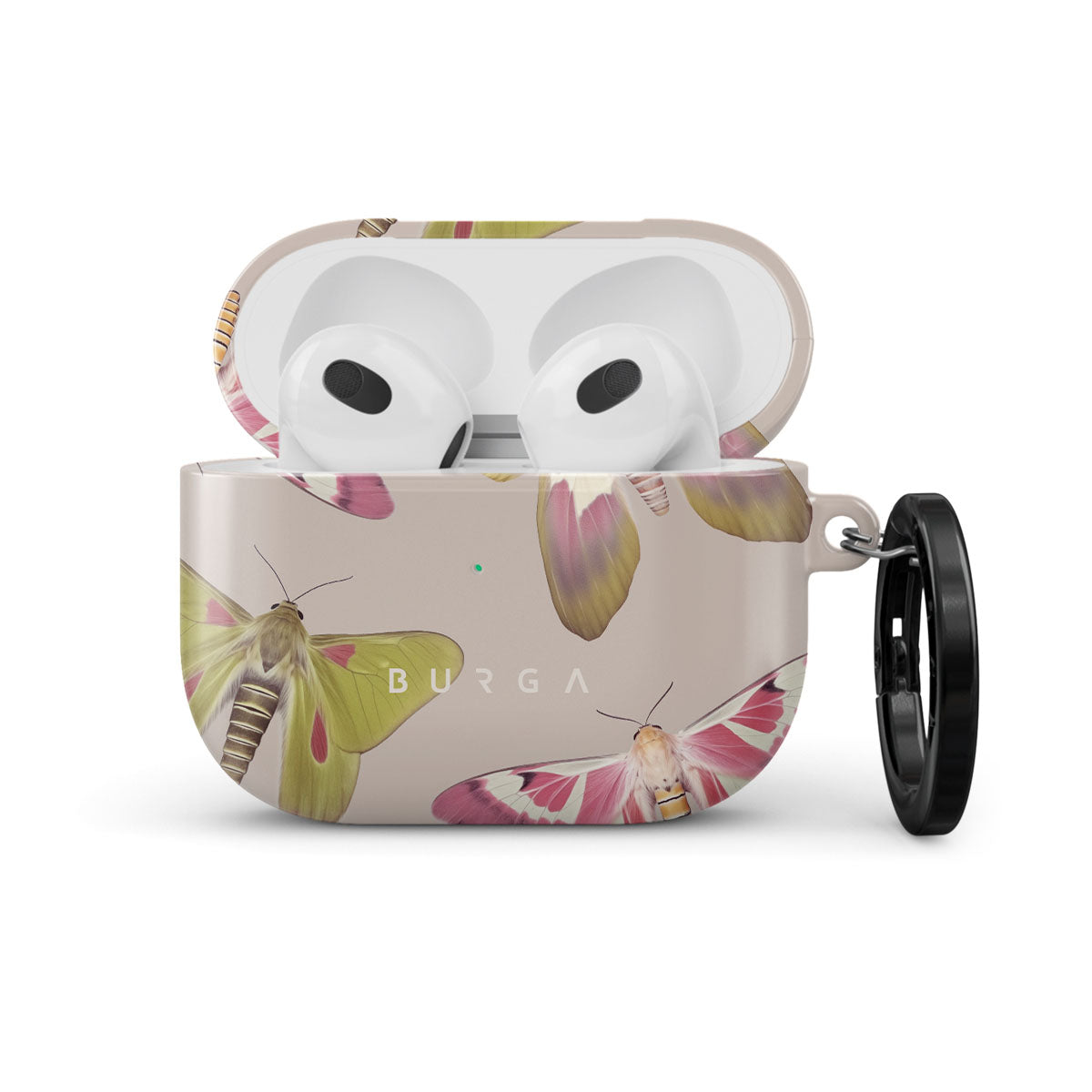 A tapestry of muted-toned moths — their wing patterns echoing tales of transformation and resilience found in nature's delicate beings. These moths, wings wide, serve as silent mentors, teaching us that every phase of life and change holds its own magic and mystery. Discover our Metamorphosis Apple Airpods 3 case coverdesign.