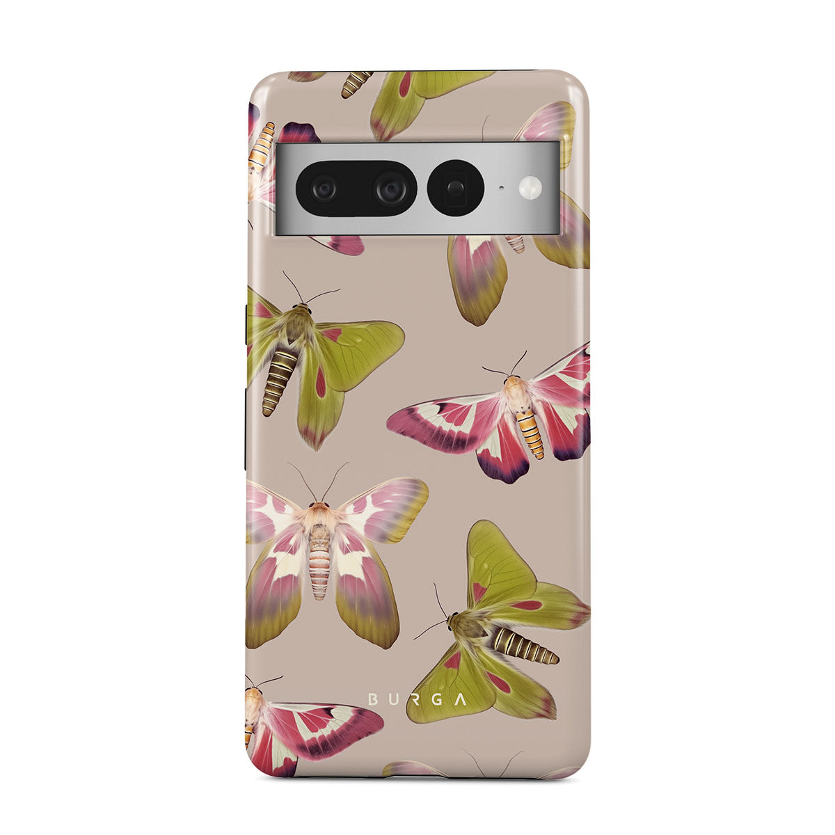 A tapestry of muted-toned moths — their wing patterns echoing tales of transformation and resilience found in nature's delicate beings. These moths, wings wide, serve as silent mentors, teaching us that every phase of life and change holds its own magic and mystery. Discover our Metamorphosis Google Pixel 7 Pro phone casedesign.