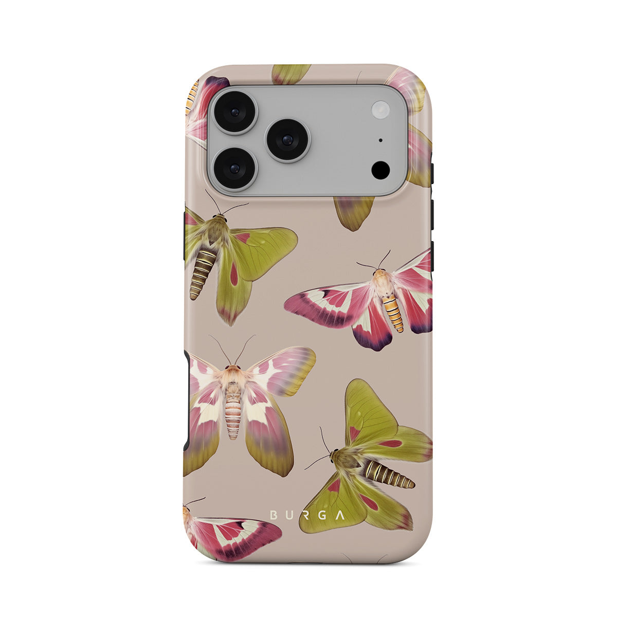 A tapestry of muted-toned moths — their wing patterns echoing tales of transformation and resilience found in nature's delicate beings. These moths, wings wide, serve as silent mentors, teaching us that every phase of life and change holds its own magic and mystery. Discover our Metamorphosis iPhone 17 Pro Max phone casedesign.