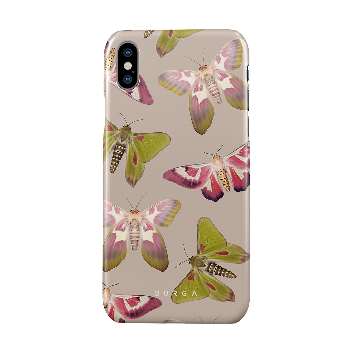 A tapestry of muted-toned moths — their wing patterns echoing tales of transformation and resilience found in nature's delicate beings. These moths, wings wide, serve as silent mentors, teaching us that every phase of life and change holds its own magic and mystery. Discover our Metamorphosis iPhone X / XS phone casedesign.