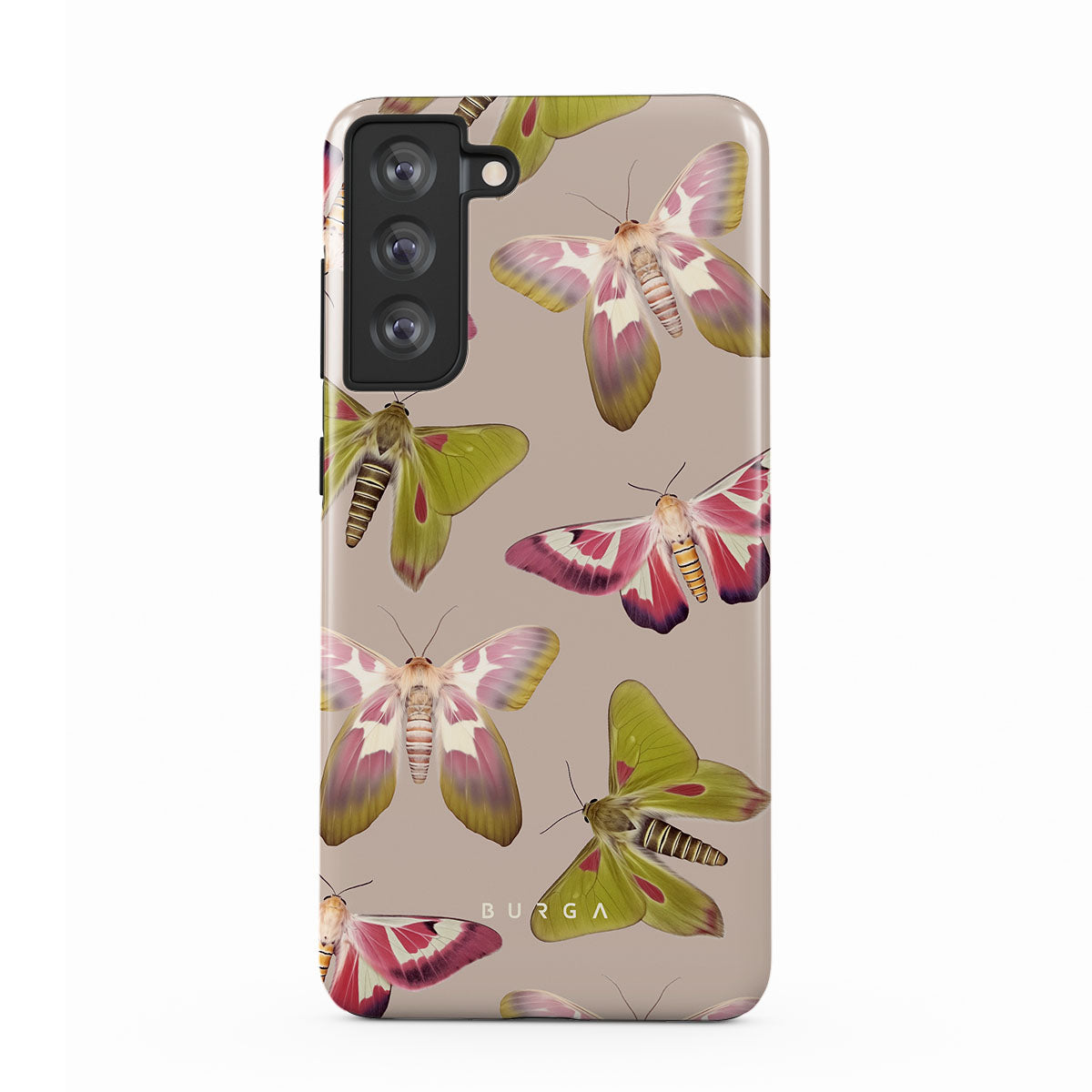 A tapestry of muted-toned moths — their wing patterns echoing tales of transformation and resilience found in nature's delicate beings. These moths, wings wide, serve as silent mentors, teaching us that every phase of life and change holds its own magic and mystery. Discover our Metamorphosis Samsung Galaxy S21 FE phone casedesign.