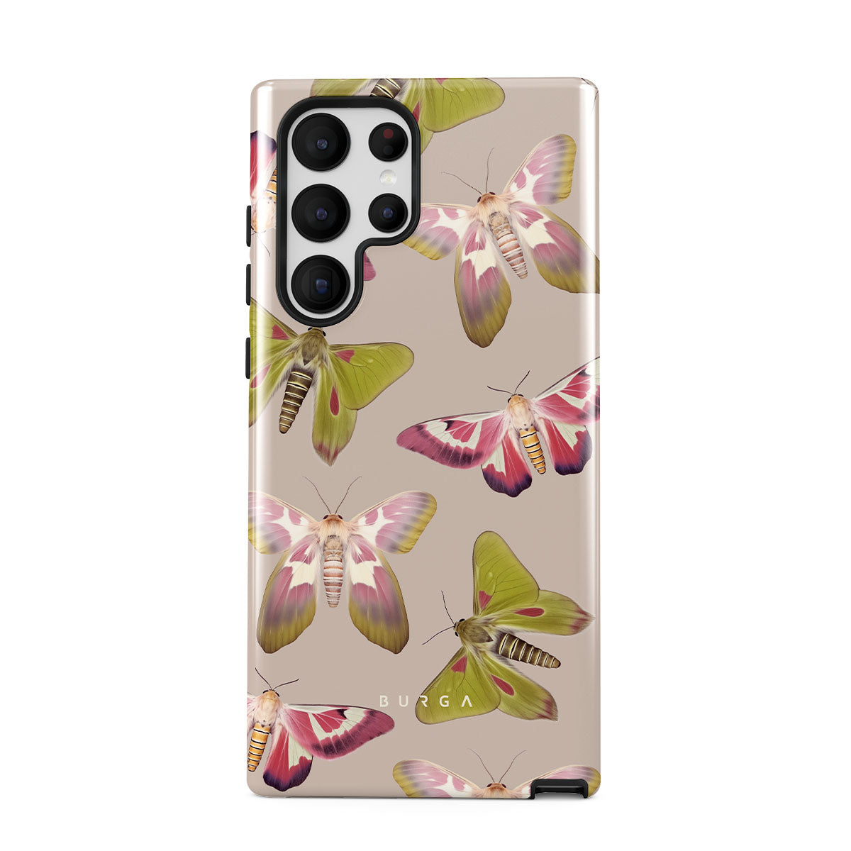 A tapestry of muted-toned moths — their wing patterns echoing tales of transformation and resilience found in nature's delicate beings. These moths, wings wide, serve as silent mentors, teaching us that every phase of life and change holds its own magic and mystery. Discover our Metamorphosis Samsung Galaxy S22 Ultra phone casedesign.