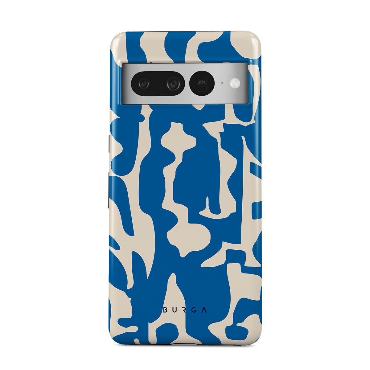 Indulge in the exquisite elegance of Mirage. Against a canvas of deep, enigmatic blue, luminous shapes gracefully disrupt the darkness, creating a captivating visual spectacle. Let this Google Pixel 7 Pro phone case be a symbol of your impeccable taste and magnetic charm.