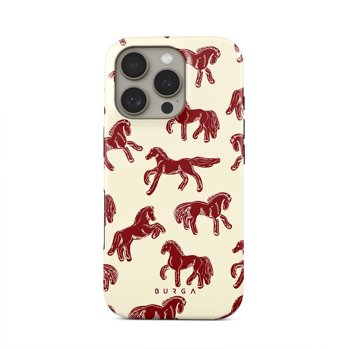 It's time to unleash your wild side with the Mustang design. Bold red horses gallop across a nude background, capturing the spirit of untamed adventure. This iPhone 16 Pro phone case is perfect for the free-spirited souls ready to ride into the unknown.