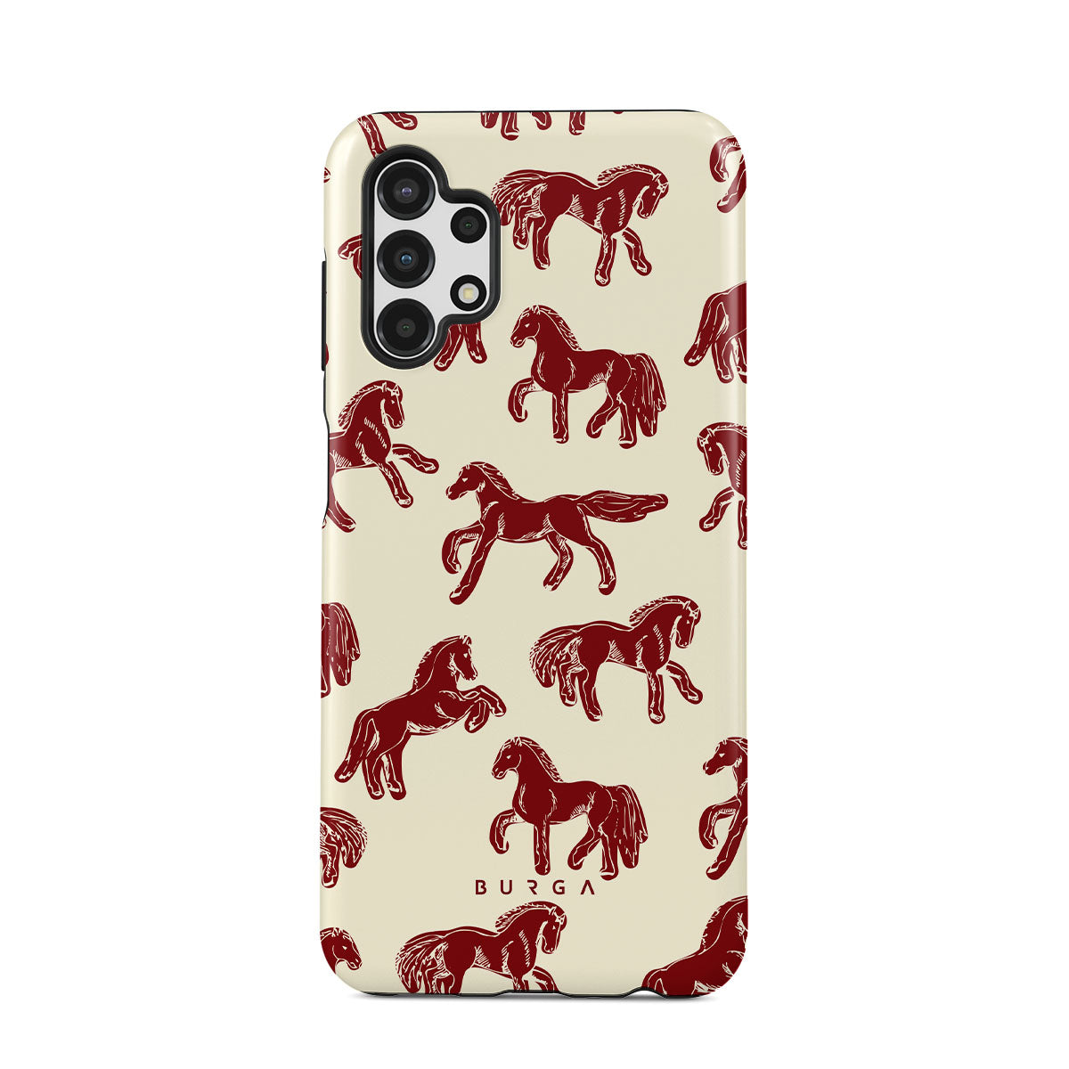 It's time to unleash your wild side with the Mustang design. Bold red horses gallop across a nude background, capturing the spirit of untamed adventure. This Samsung Galaxy A13 4G phone case is perfect for the free-spirited souls ready to ride into the unknown.