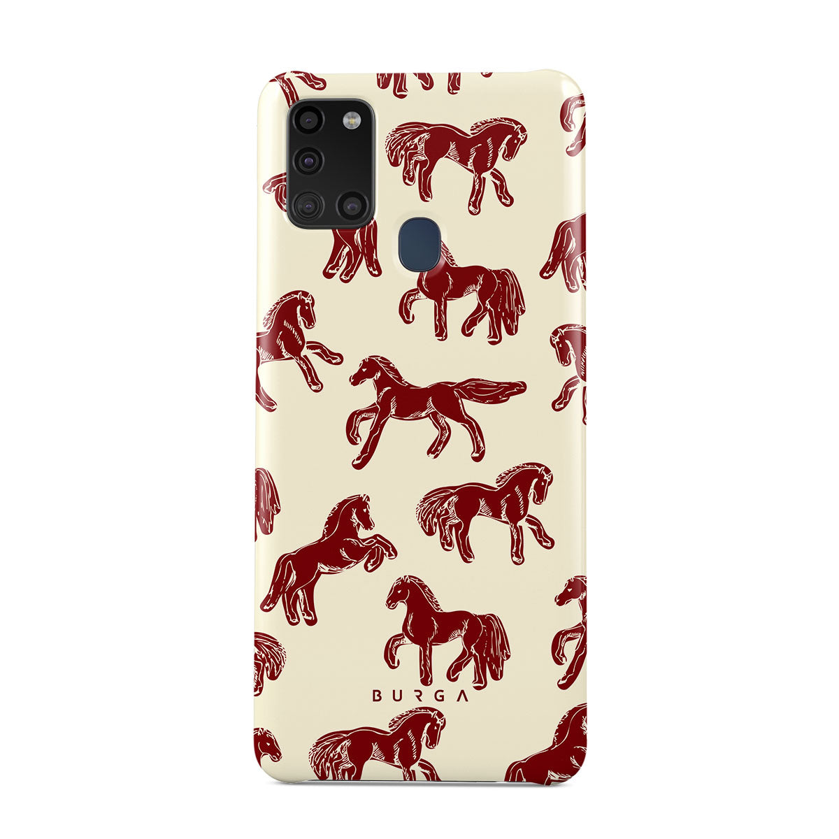 It's time to unleash your wild side with the Mustang design. Bold red horses gallop across a nude background, capturing the spirit of untamed adventure. This Samsung Galaxy A21s 4G phone case is perfect for the free-spirited souls ready to ride into the unknown.
