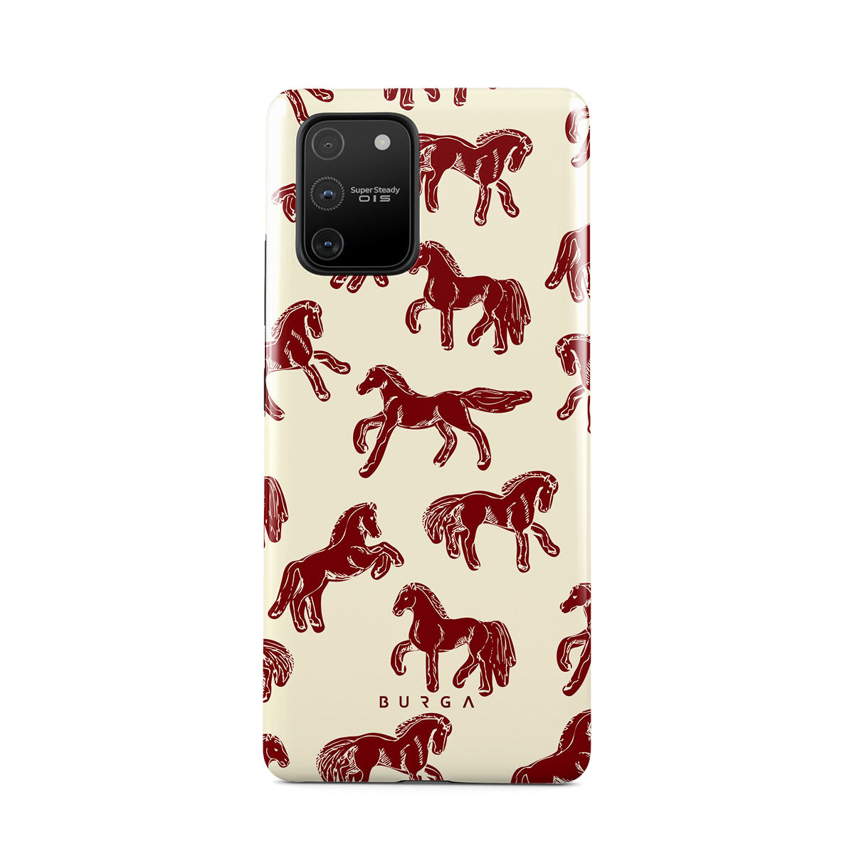 It's time to unleash your wild side with the Mustang design. Bold red horses gallop across a nude background, capturing the spirit of untamed adventure. This Samsung Galaxy S10 Lite phone case is perfect for the free-spirited souls ready to ride into the unknown.
