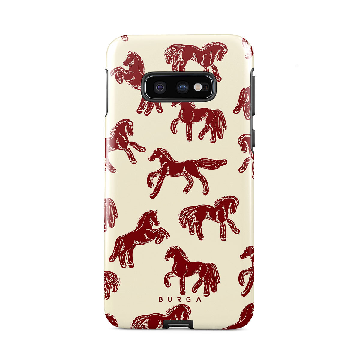 It's time to unleash your wild side with the Mustang design. Bold red horses gallop across a nude background, capturing the spirit of untamed adventure. This Samsung Galaxy S10E phone case is perfect for the free-spirited souls ready to ride into the unknown.