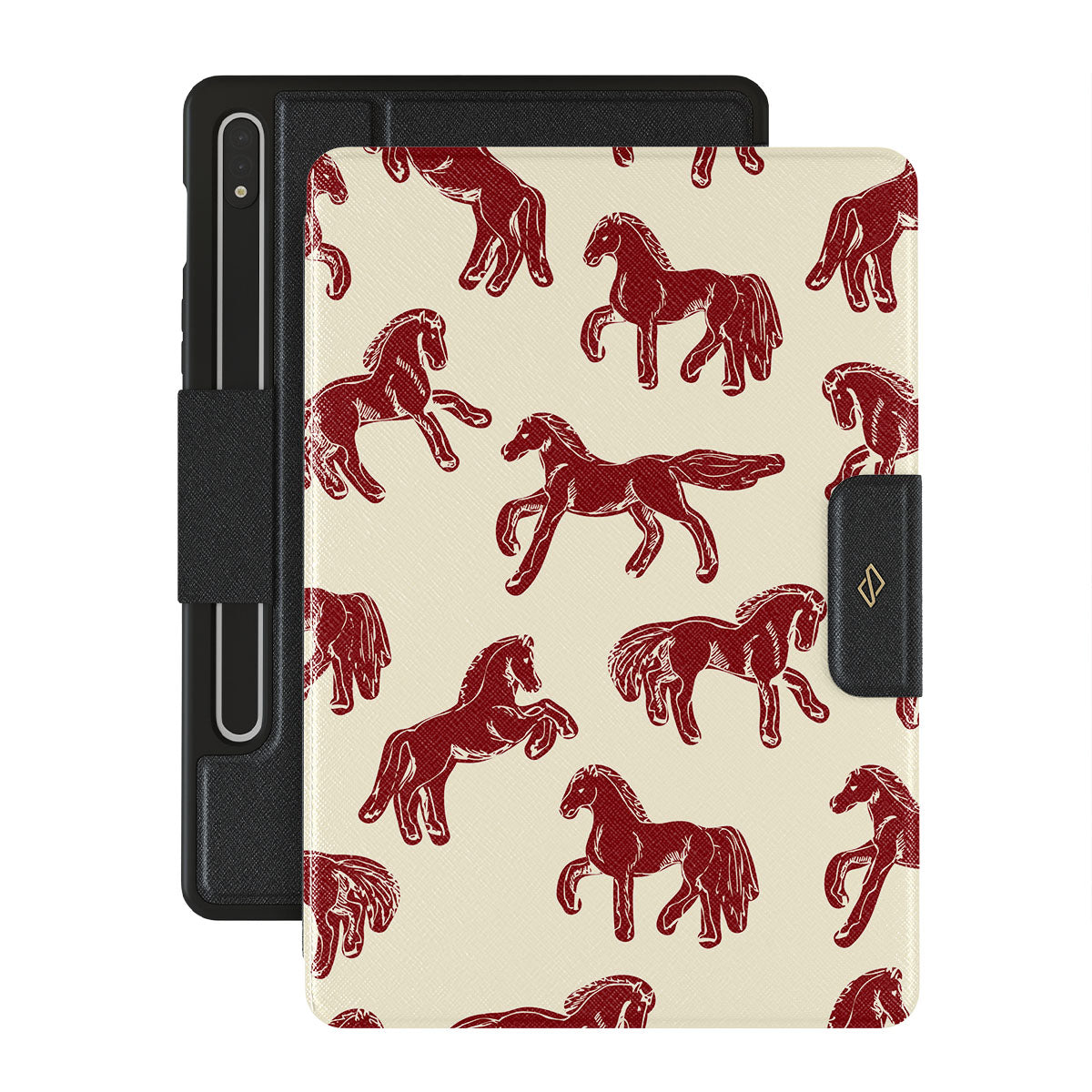 It's time to unleash your wild side with the Mustang design. Bold red horses gallop across a nude background, capturing the spirit of untamed adventure. This Samsung Galaxy Tab S9 FE folio case is perfect for the free-spirited souls ready to ride into the unknown.