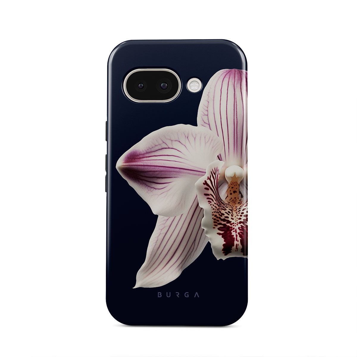 The white orchid blooms boldly upon a night sky blue, a beacon of clarity in the darkness. Our Nectar Google Pixel 9a phone case design speaks to the soul's desire to find light within, to illuminate the hidden paths of self-discovery that only reveal themselves under the cloak of introspection.