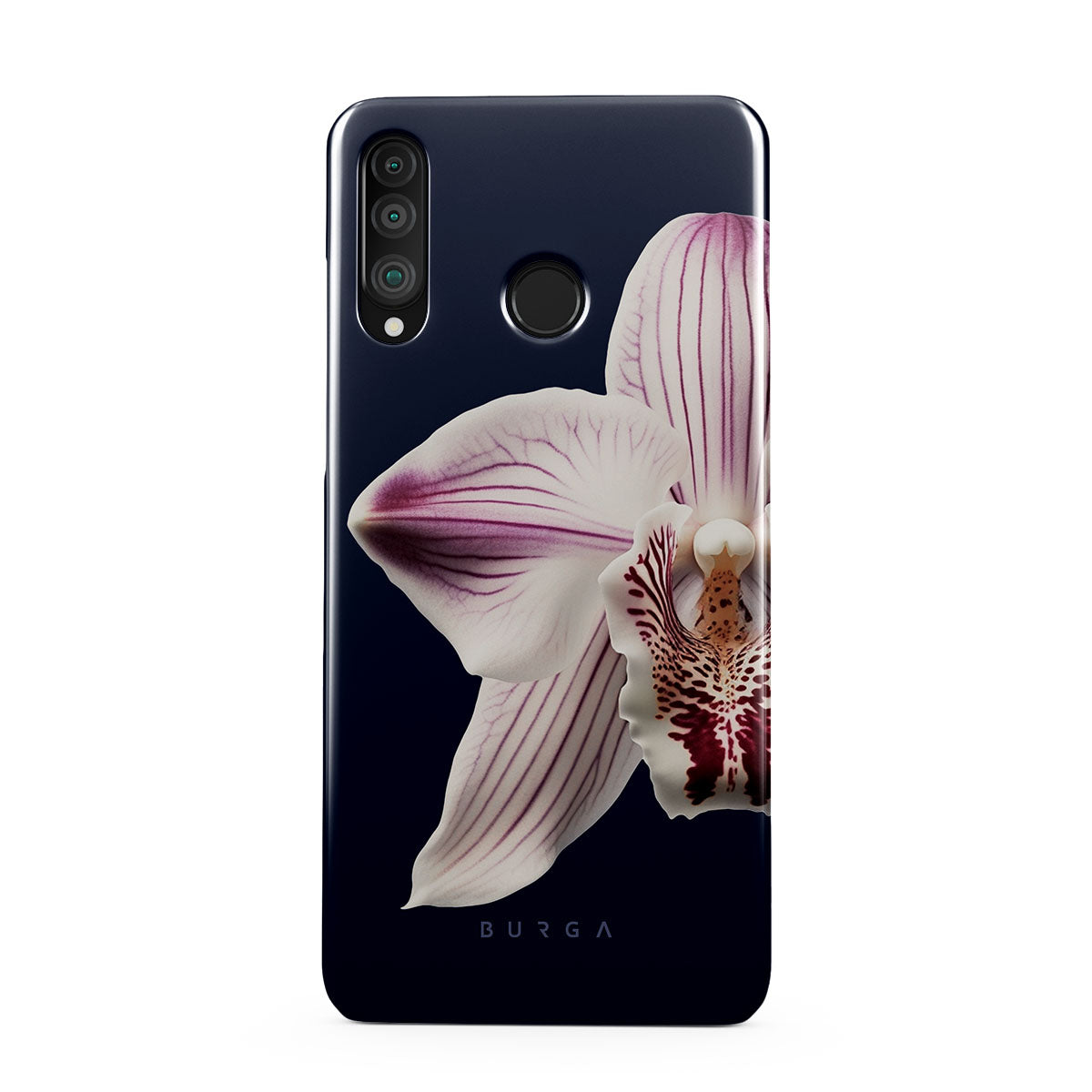 The white orchid blooms boldly upon a night sky blue, a beacon of clarity in the darkness. Our Nectar Huawei P30 Lite phone case design speaks to the soul's desire to find light within, to illuminate the hidden paths of self-discovery that only reveal themselves under the cloak of introspection.