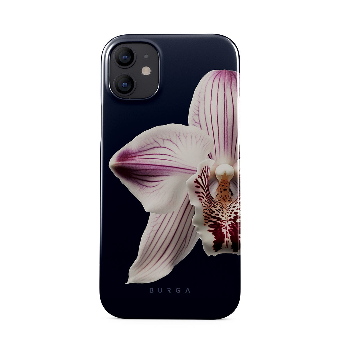 The white orchid blooms boldly upon a night sky blue, a beacon of clarity in the darkness. Our Nectar iPhone 12 Mini phone case design speaks to the soul's desire to find light within, to illuminate the hidden paths of self-discovery that only reveal themselves under the cloak of introspection.