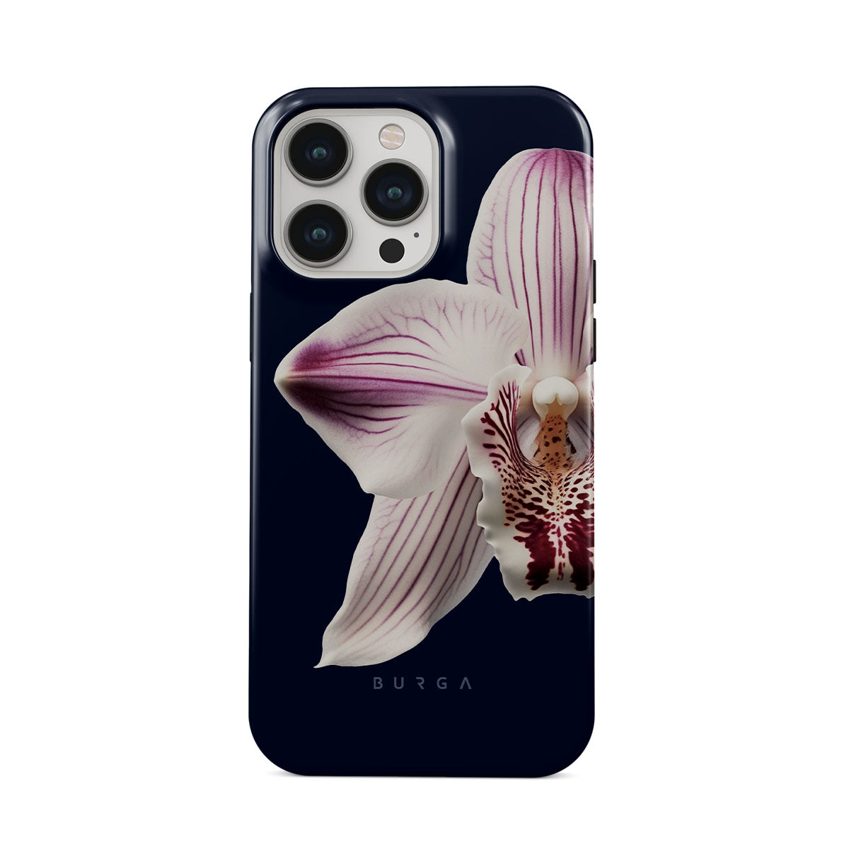 The white orchid blooms boldly upon a night sky blue, a beacon of clarity in the darkness. Our Nectar iPhone 13 Pro phone case design speaks to the soul's desire to find light within, to illuminate the hidden paths of self-discovery that only reveal themselves under the cloak of introspection.