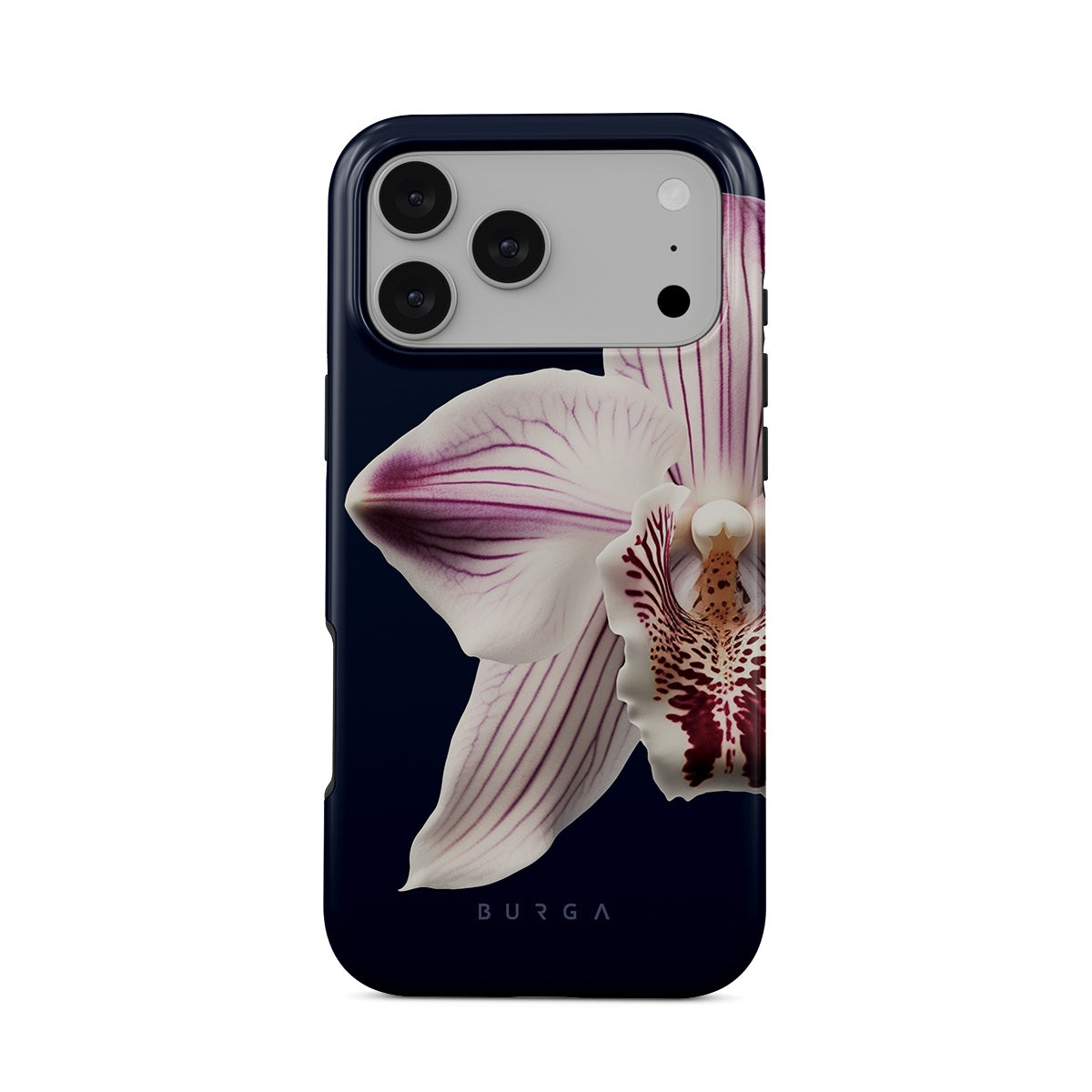 The white orchid blooms boldly upon a night sky blue, a beacon of clarity in the darkness. Our Nectar iPhone 17 Pro Max phone case design speaks to the soul's desire to find light within, to illuminate the hidden paths of self-discovery that only reveal themselves under the cloak of introspection.