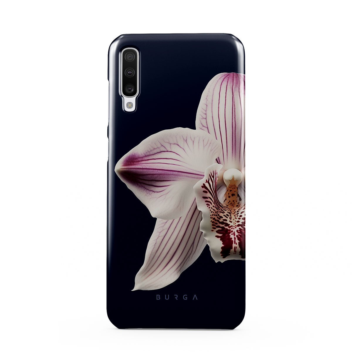 The white orchid blooms boldly upon a night sky blue, a beacon of clarity in the darkness. Our Nectar Samsung Galaxy A70 phone case design speaks to the soul's desire to find light within, to illuminate the hidden paths of self-discovery that only reveal themselves under the cloak of introspection.