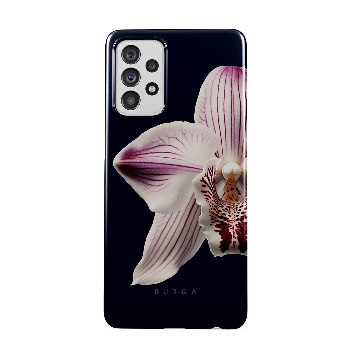The white orchid blooms boldly upon a night sky blue, a beacon of clarity in the darkness. Our Nectar Samsung Galaxy A72 4G / 5G phone case design speaks to the soul's desire to find light within, to illuminate the hidden paths of self-discovery that only reveal themselves under the cloak of introspection.
