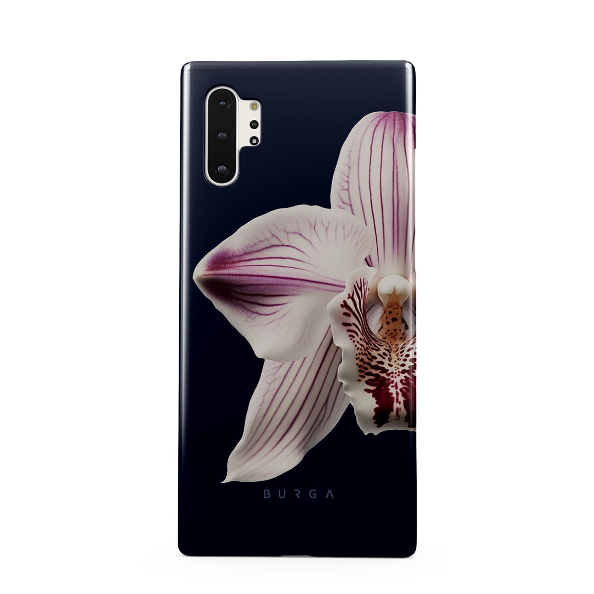 The white orchid blooms boldly upon a night sky blue, a beacon of clarity in the darkness. Our Nectar Samsung Galaxy Note 10 Plus phone case design speaks to the soul's desire to find light within, to illuminate the hidden paths of self-discovery that only reveal themselves under the cloak of introspection.