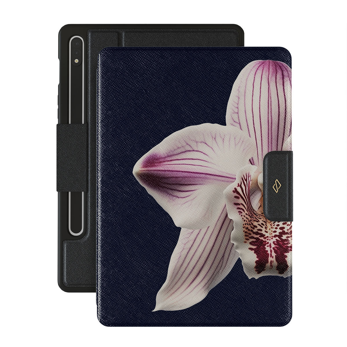 The white orchid blooms boldly upon a night sky blue, a beacon of clarity in the darkness. Our Nectar Samsung Galaxy Tab S8+/S7+/S7 FE folio case design speaks to the soul's desire to find light within, to illuminate the hidden paths of self-discovery that only reveal themselves under the cloak of introspection.
