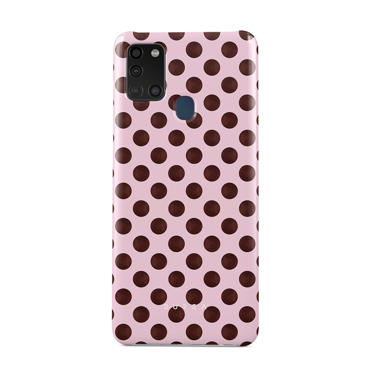 This design features: a retro polka dot pattern, pink background with brown polka dots.