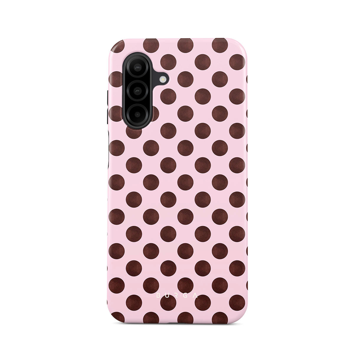 This design features: a retro polka dot pattern, pink background with brown polka dots.